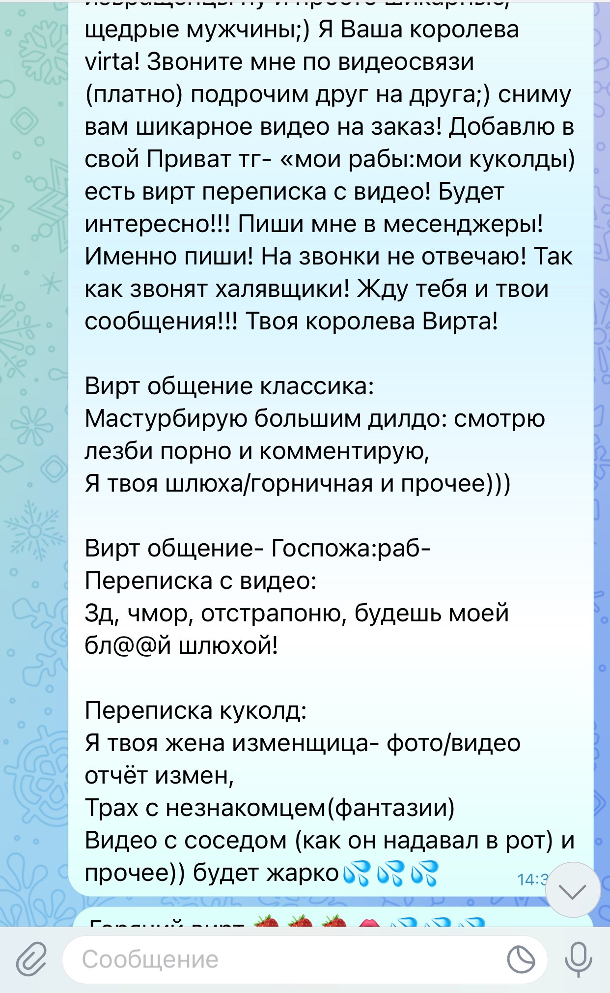 Я твоя красивая жена:шлюха! Повиртуалю с тобой! Одену короткую юбку - пойду в бар а дальше…. Рассказ о моих приключениях (платно)- видеозвонок и расскажу как и с кем ебалась; ) видео/фото! Добавлю в мою группу- рабы /куколды!(вход платный) пиши мне быстрее- мой муж рогоносец! Именно пиши! На звонки не отвечаю- так как рот занят !